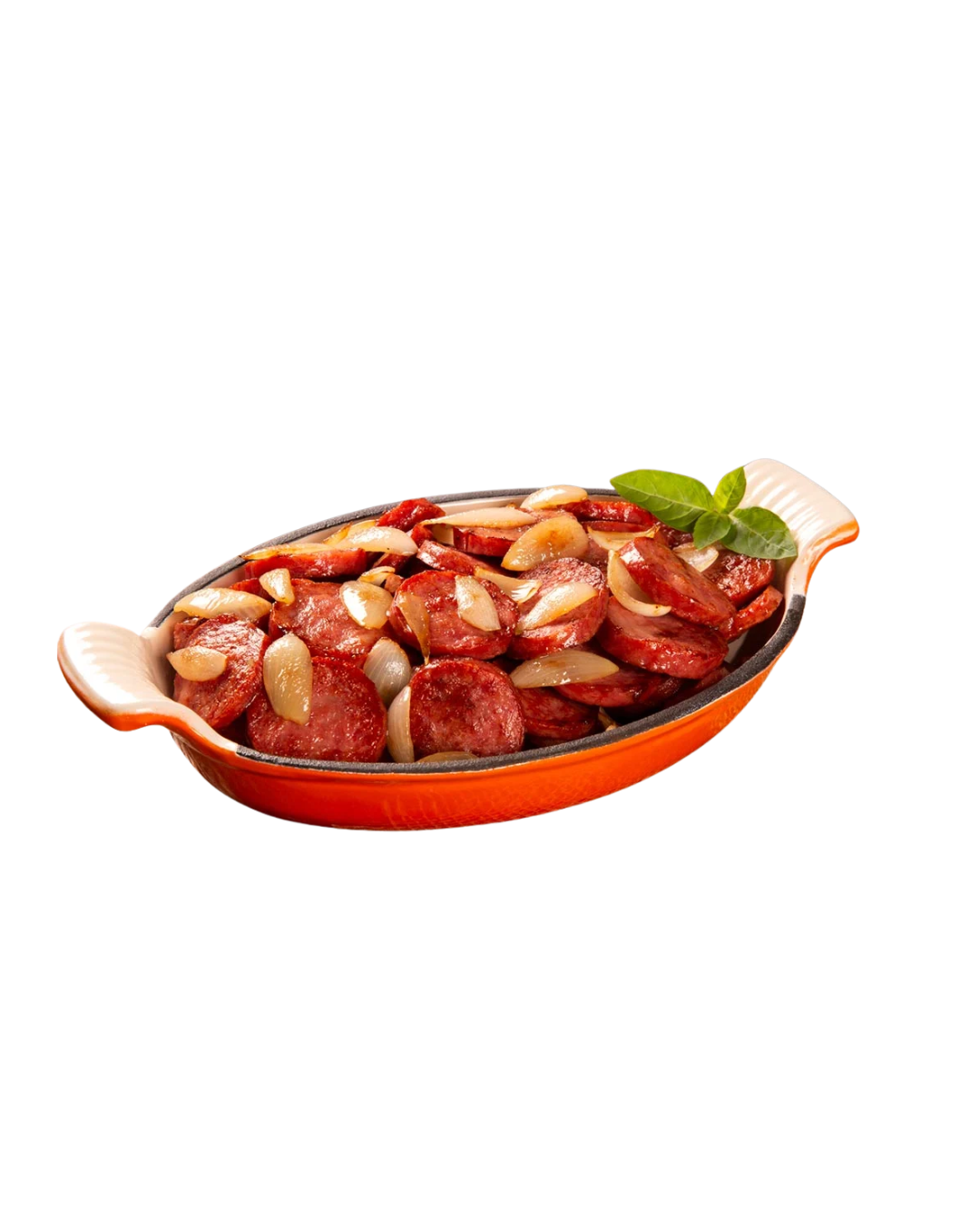 Arroz, salada, molho, farofa, mandioca. Serve duas pessoas.