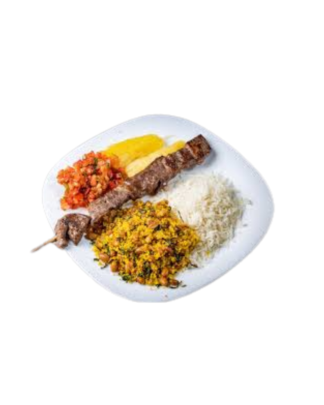 Arroz, salada, molho, farofa, mandioca. Serve duas pessoas.
